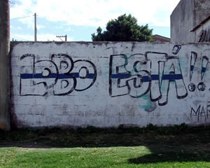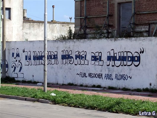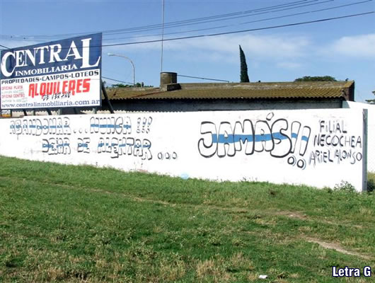 Llegar a Necochea y antes que puedas ver una gota de mar, la Filial Ariel Alonso recibe a los triperos con una imponente pintada que reza la frase "¡Abandonar nunca, dejar de alentar JAMAS!"